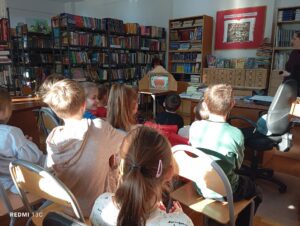Podczas spotkania dzieci zapoznały się z biblioteką, jej księgozbiorem oraz zasadami korzystania z książek. Dowiedziały się, jak należy dbać o wypożyczone publikacje, jak zachowywać się w bibliotece oraz dlaczego czytanie jest tak ważne i potrzebne w codziennym życiu.