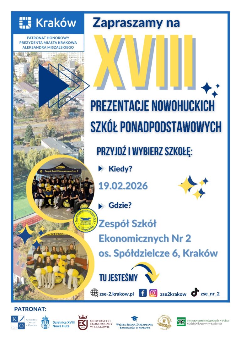 Zespół Szkół Ekonomicznych Nr 2 im. Ignacego Daszyńskiego w Krakowie, os. Spółdzielcze 6 serdecznie zaprasza uczniów wraz z opiekunami i rodzicami do udziału XVII Prezentacjach Nowohuckich Szkół Ponadpodstawowych, które odbędą się 27 lutego 2025 r. Projekt jest formą targów edukacyjnych, podczas których wystawcami są licea ogólnokształcące, technika, szkoły branżowe, centra doskonalenia zawodowego oraz placówki i organizacje wspierające pracę szkół.