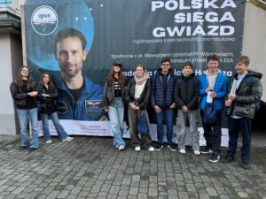 4 listopada ośmioro uczniów z klasy 8d pod opieką pani Agaty Andzlik i pani Anny Dróżdż reprezentowało naszą szkołę podczas spotkania z astronautą Sławoszem Uznańskim – Wiśniewskim. Wydarzenie zorganizowano na Akademii Górniczo – Hutniczej w ramach projektu IGNIS – „Polska sięga gwiazd”. Po obejrzeniu ciekawych eksperymentów fizycznych przeprowadzonych przez pracowników uczelni, na scenie pojawił się drugi Polak, który był w kosmosie. Sławosz Uznański – Wiśniewski odpowiadał na pytania zgromadzonej młodzieży, w tym na pytania uczennic naszej szkoły. To było pasjonujące spotkanie.